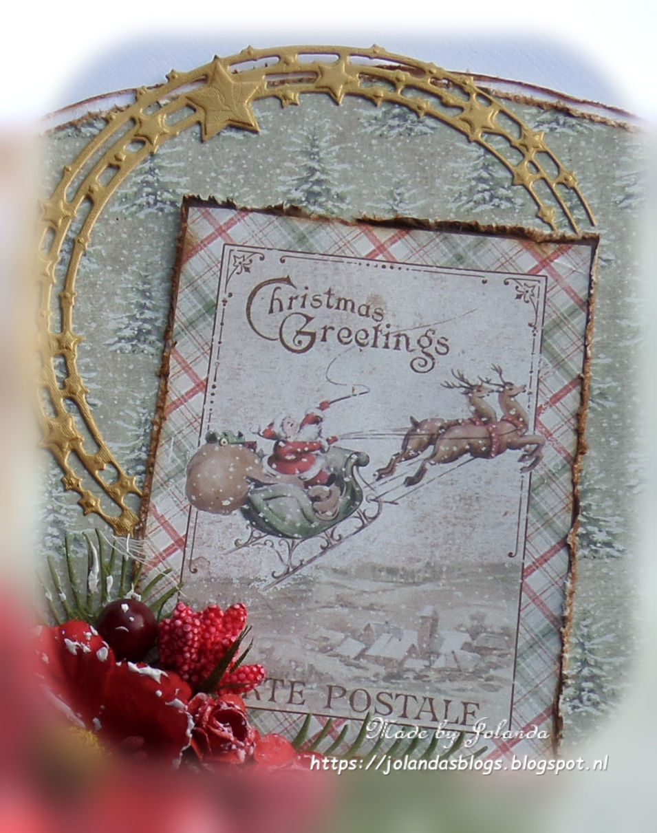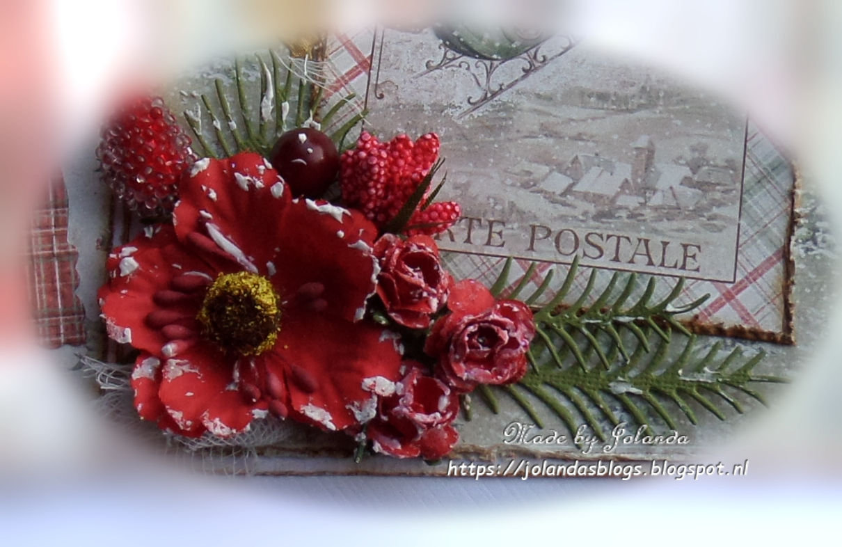 Aan de onderkant een bloementoef in mooi kerstrood met wat dennentakken. Op de bloemen en takjes heb ik wat sneeuw aangebracht zodat het allemaal lekker winters er uit ziet.