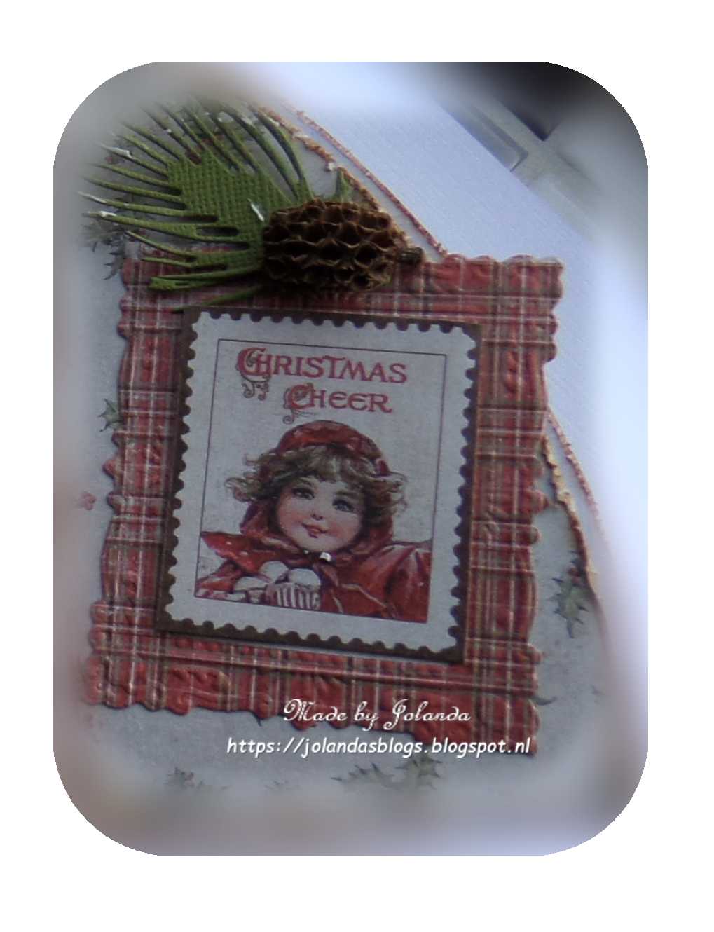 De mal heb ik gesneden uit wit linnen cardstock en vervolgens alle randen met de distresser bewerkt en vervolgens met Vintage Photo van Distress inkt een mooi oud randje gegeven.Zoals gezegd is het designpapier van Maja Design uit de collectie I Wish". De 3 plaatjes zijn daar ook van. Ook van de stukken designpapier zijn de randen bewerkt met de distresser en Vintage Photo.